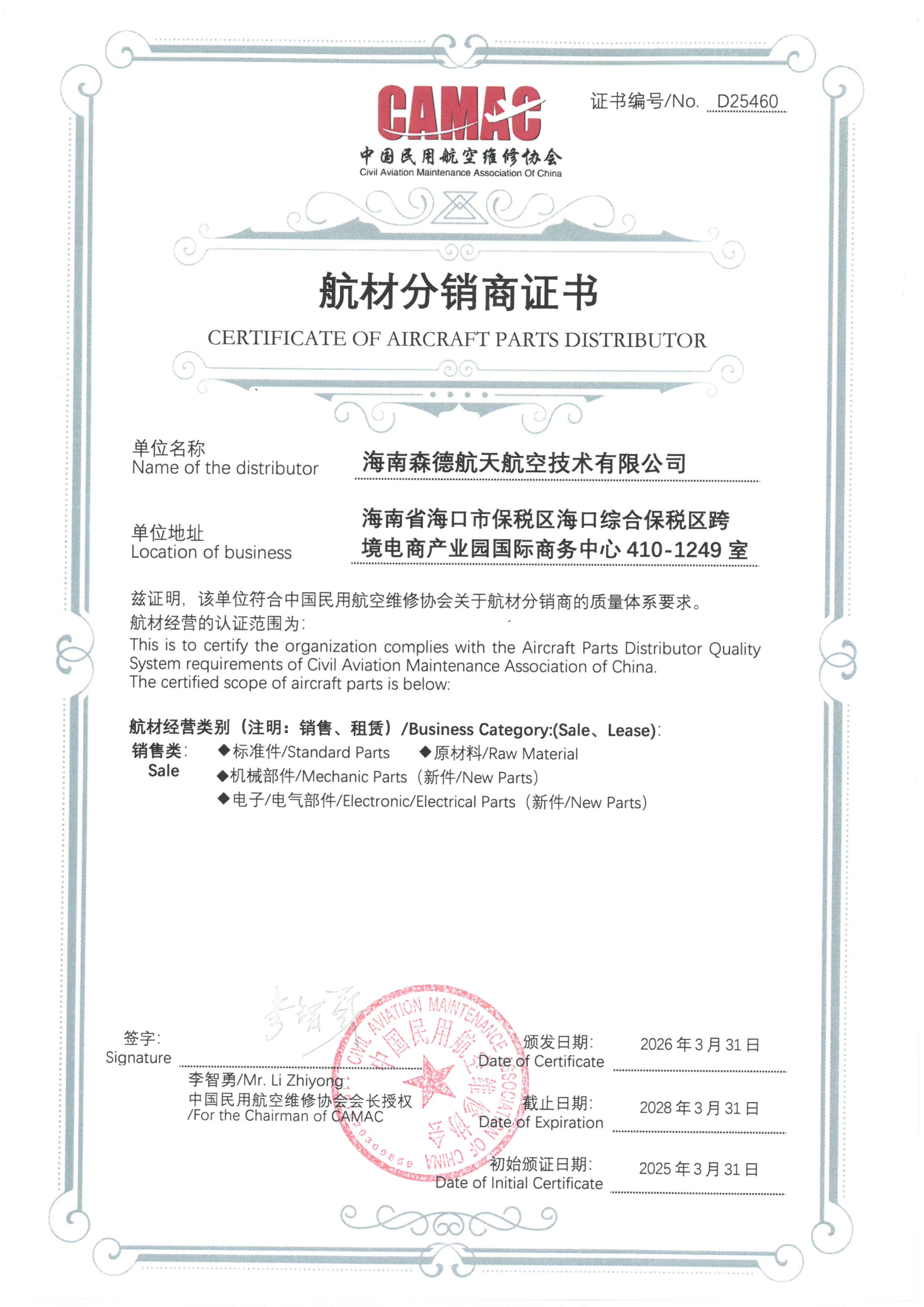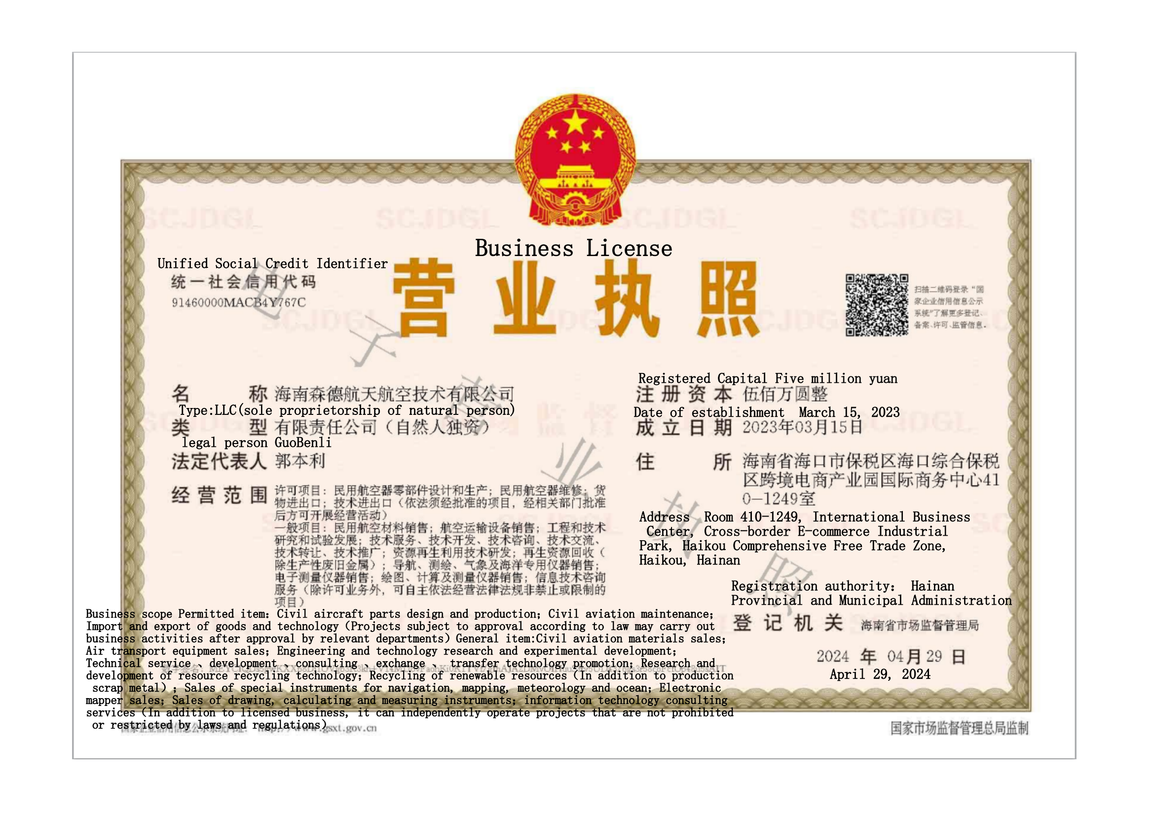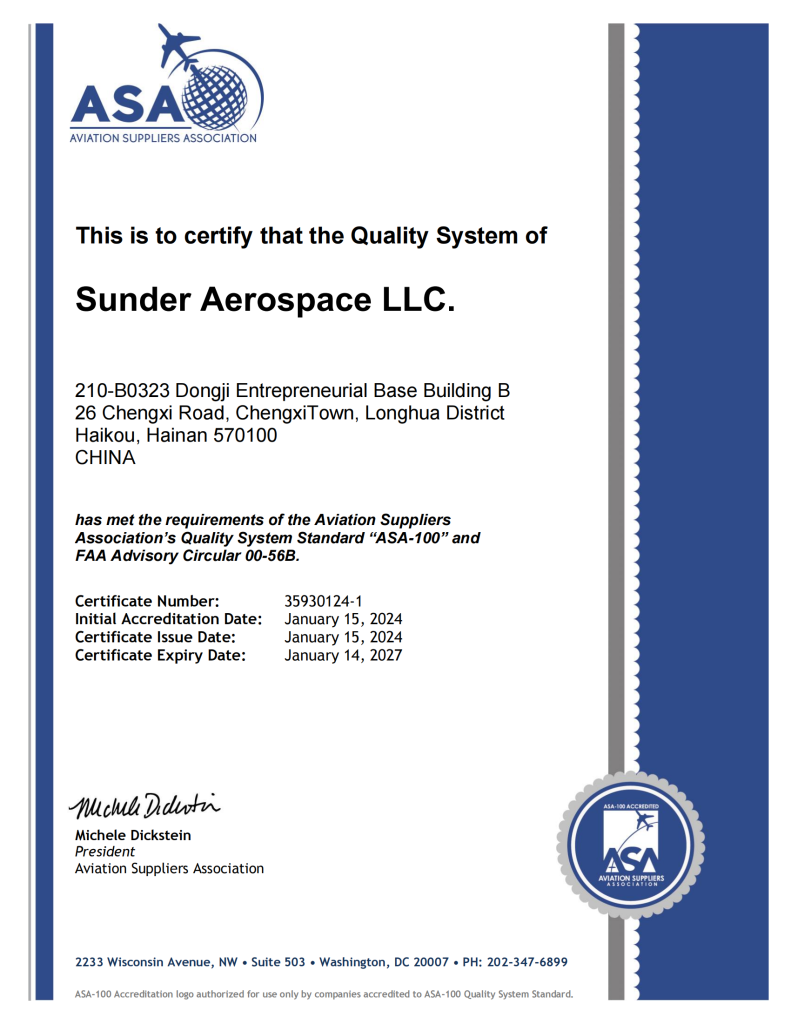 心怀蓝天白云 直面澎湃大海 About Us 海南森德成立于2023年,坐落于中国(海南)自由贸易试验区。作为新生企业,森德的团队拥有超50年的航空业从业经验, 团队的工作经验涵括零部件维修、飞机发动机的贸易和租赁、航材的采购、质量管理以及全球航材销售等。 森德的业务包括:飞机发动机销售、航材以及地面设备的销售和采购以及教学培训器材支持等。作为航天航空领域的从业者,森德始终秉持“无质量,无生命”的经营理念,以符合国际行业标准为原点,符合质量目标为驱动,建立了高标准,国际接轨的全价值链质量管理体系,并贯穿产品的采购,仓储,销售整套服务流程。受到国内外客户的高度评价及认可。森德于2024年1月获得ASA-100质量体系标准资质证书,进一步拓展了森德在航材供应方面的业务能力和市场认可。未来,森德将继续提供优质的产品服务,完善质量体系建设,提升公司各项技术能力,打造高标准,高效能的航空部件供应商。 Learn more Our Services 发动机业务为航空公司用户提供国际一流的发动机保障解决方案,业务范围涵盖航空发动机的融资租赁,经营租赁,售后回租,共享库平台,AOG支援等。保障的发动机型号包括CFM56-5B、CFM56-5C、CFM56-7B、CFMLEAP、GE90、GEnx、CF6-80,CF34-3B、CF34-10E6、V2500、PW2000、PW4000。 周转件共享引进国际先进的保障模式,为用户提供各种机型的航材包修服务保障,将用户一次性、大规模的初始库存支出占用,转变为有计划的、可控的稳定保障支出。服务内容包括提供备件交换保障,并负责拆下故障件的维修、物流等完整的项目运营管理工作。用户目前以各类货航及新兴或低成本航空公司为主。现保障的主要机型包括B777-300ER, A320及A350, 积极推进B787、B737NG、B737MAX、A320NEO市场。 航材销售通过集合国内航空公司用户需求,批量采购零备件器材有效降低采购成本。充分利用遍布全国的仓储及物流网络,通过库存前置贴近用户,提高备件保障水平和效率。目前已与国内的主要航空公司及修理厂建立起长期稳定的分销及寄售合作,主要产品涵盖B737NG、B737MAX、B787、B777-300ER、A320系列、A330、A350等机型航线维护及修理所需器材,以及IDG、APU、反推等修理所需消耗器材。 大部件业务积极搭建以起落架为代表的、面向全行业的大部件共享平台,为航空公司用户提供包含起落架、反推、APU等大部件租赁、交换、维修、AOG支援等整体解决方案。 Qualification certificate Contact US Tony QinSales departmentTEL:+86 15827359399EMAIL: tony@sunderaerospace.comADD: International Business Center 410-1249, Haikou Comprehensive Free Trade Zone, Haikou, Hainan, China